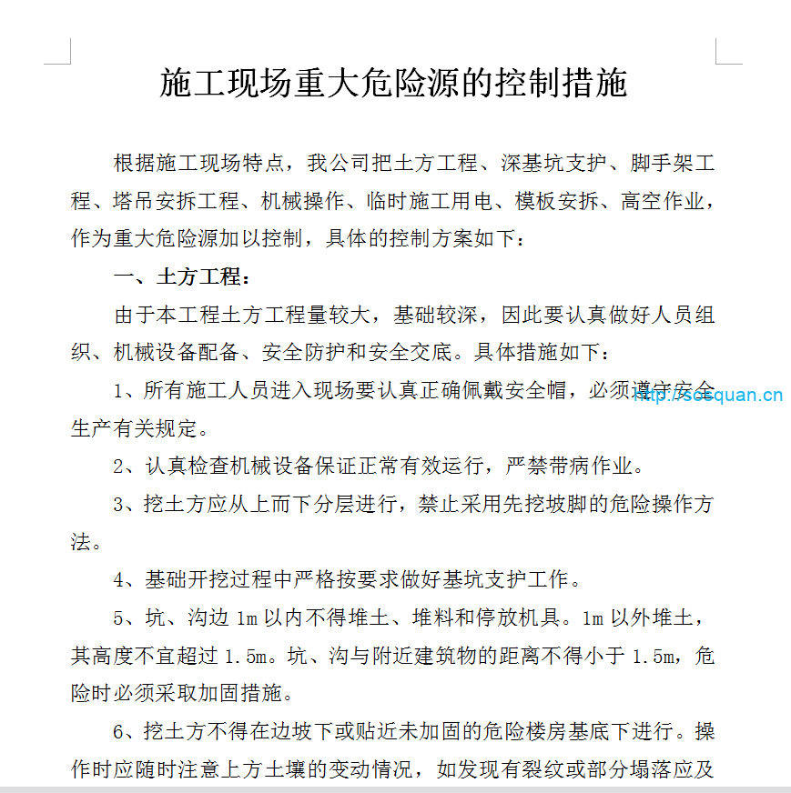 当前位置: 首页安全生产正文 施工现场重大危险源的控制措施 格式:doc <部分内容截图> 本文原件 ***此处内容登录后可见*** 温馨提示:此处为隐藏内容,需要登录后可见 登录查看 须知 1资料收集于互联网,站内视频、图文、文字仅供交流学习使用。如侵犯到您的合法权益,请联系本站处理。 在手机上访问本站时,仅可以浏览内容,如需下载资料,请在电脑浏览器输入网址:sosquan.cn进行访问下载,资料默认解压密码为1 2资料众多无法保证资料其适用性,资料实例用于参考学习,学会变通,万变不离其宗,省时省力,助你快速提升! 3由于本站收录资料众多,有个别资料可能出现重复,请悉知。 4如有问题及时联系QQ:806096373处理 收藏 链接