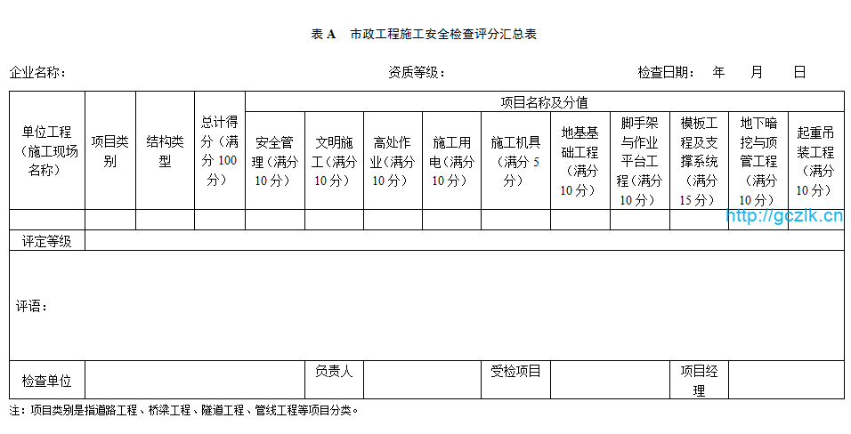 9.1.2 市政工程施工安全检查评定应符合本标准第3章~第8章中各检查评定项目的有关规定,并应按本标准附录A、附录B的评分表进行评分。检查评分表应分为通用检查项目、地基基础工程、脚手架与作业平台工程、模板工程及支撑系统、地下暗挖与顶管工程、起重吊装工程分项检查评分表和检查评分汇总表。