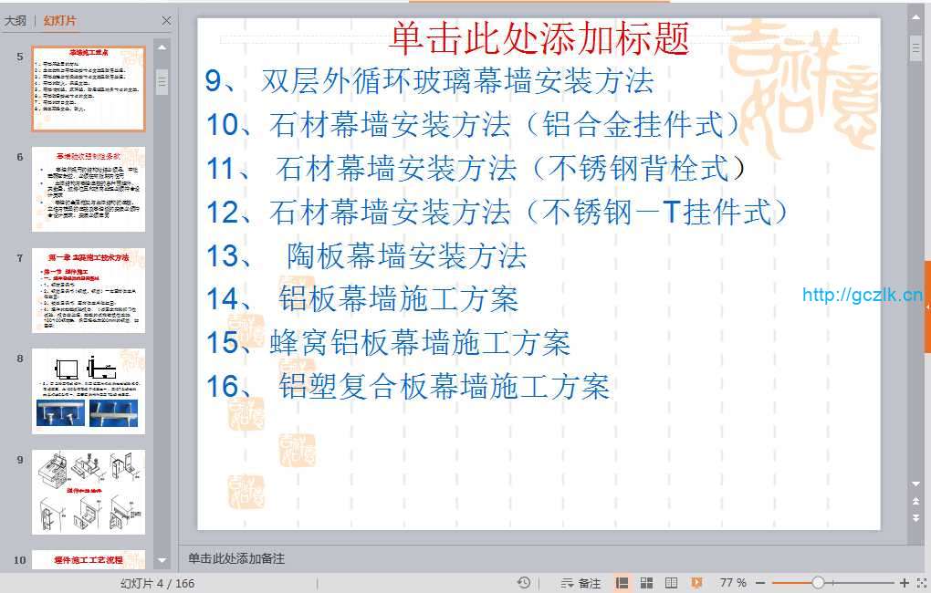 当前位置: 首页图解工艺正文 内容 :幕墙工程施工技术交底PPT(166页) 格式 :PPT 页数 :166 资料部分内容截图: 高清文档资料下载地址: 隐藏内容此处内容需要权限查看普通不可下载会员免费永久会员免费推荐暂无购买权限 须知 1资料收集于互联网,站内视频、图文、文字仅供交流学习使用。如侵犯到您的合法权益,请联系本站处理。 在手机上访问本站时,仅可以浏览内容,如需下载资料,请在电脑浏览器输入网址:sosquan.cn进行访问下载,资料默认解压密码为1 2资料众多无法保证资料其适用性,资料实例用于参考学习,学会变通,万变不离其宗,省时省力,助你快速提升! 3由于本站收录资料众多,有个别资料可能出现重复,请悉知。 4如有问题及时联系QQ:806096373处理 交底施工 收藏 链接