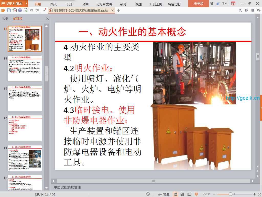 当前位置: 首页图解工艺解读正文 内容 :GB30871-2014动火作业规范解读 格式 :PPT 页数 :51 解压密码 : 1 GB30871-2014动火作业规范解读 须知 1资料收集于互联网,站内视频、图文、文字仅供交流学习使用。如侵犯到您的合法权益,请联系本站处理。 在手机上访问本站时,仅可以浏览内容,如需下载资料,请在电脑浏览器输入网址:sosquan.cn进行访问下载,资料默认解压密码为1 2资料众多无法保证资料其适用性,资料实例用于参考学习,学会变通,万变不离其宗,省时省力,助你快速提升! 3由于本站收录资料众多,有个别资料可能出现重复,请悉知。 4如有问题及时联系QQ:806096373处理 规范 收藏 链接